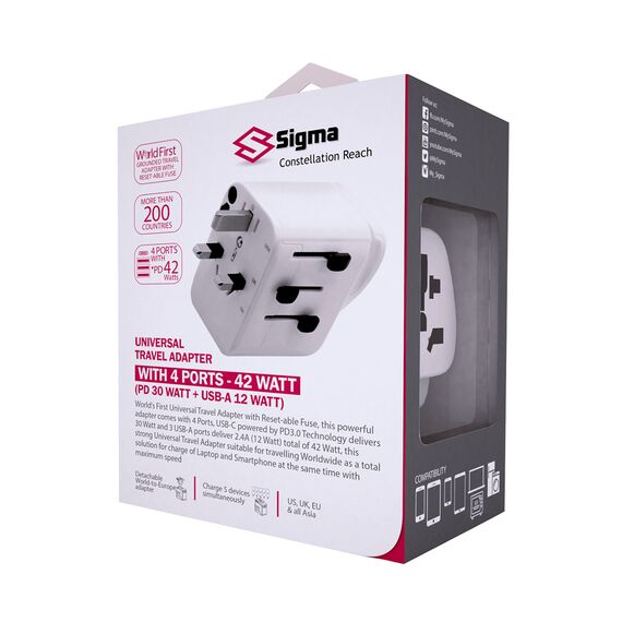 World First Universal Travel Adapter with Reset-able Fuse, this powerful adapter comes with 4 Ports, one is USB-C powered by PD3.0 Technology delivers 30 Watt and 3 USB-A ports that can deliver 2.4A ( 12 Watt ) with total of 42 Watt. this strong Universal Travel Adapter suitable for travelling Worldwide as total solution for charge of Laptop and Smartphone at the same time with maximum speed